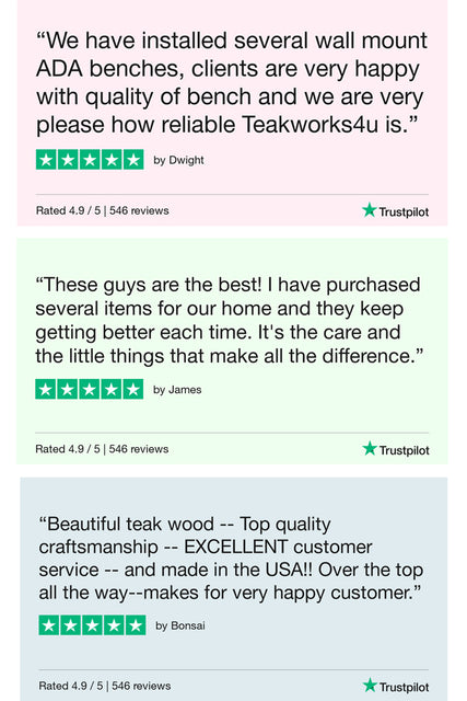Quality and craftsmanship are hallmarks of Teakworks4u products. The Teakworks4u craftsmen have years of experience in woodworking and carpentry and they take great pride in producing the finest quality teak mats and benches available today. Teakworks4u handcrafts every teak mat and bench they sell, including specially designed and ordered pieces. All of the products are also hand sanded and inspected at least two times as they go through the various areas of our finishing department (footing, oiling, bracketing, and packaging). High quality is top of mind through each step of the way!
