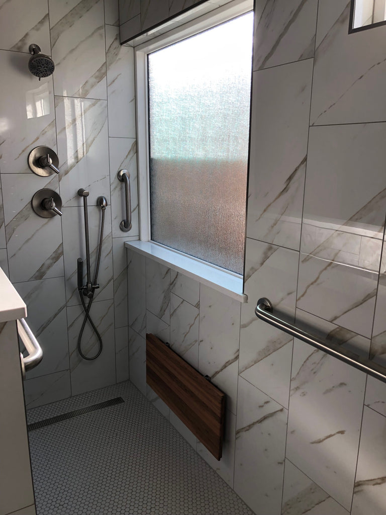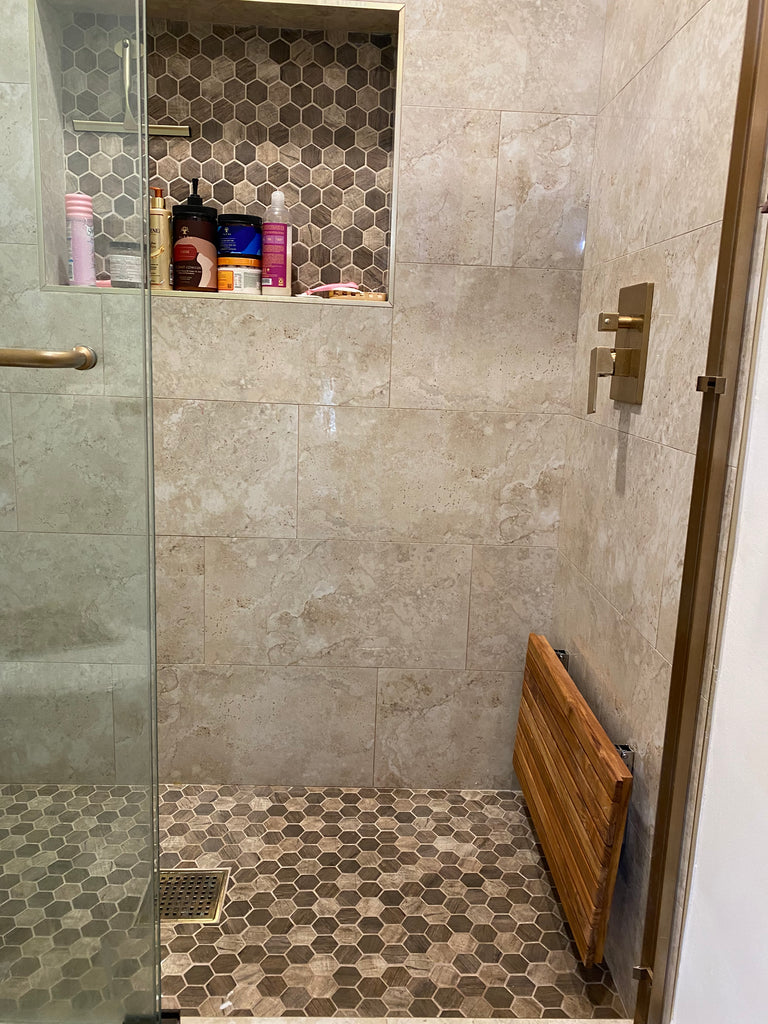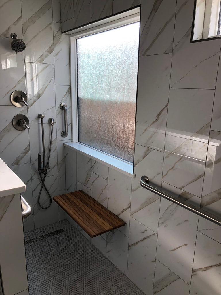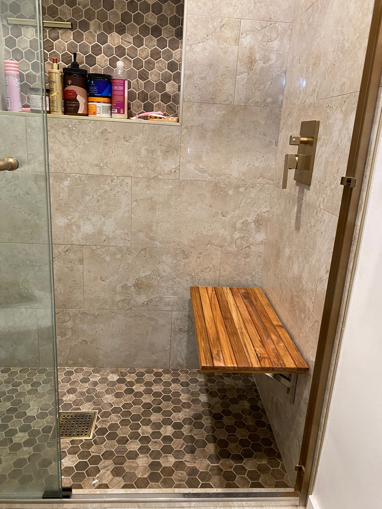Measuring 30"W x 12.5"D, this folding bench is thoughtfully designed to fit seamlessly in areas where space is limited. Whether it's your shower, foyer, mudroom, laundry room, or even outdoors, this bench offers endless possibilities. Our customers' creativity knows no bounds!