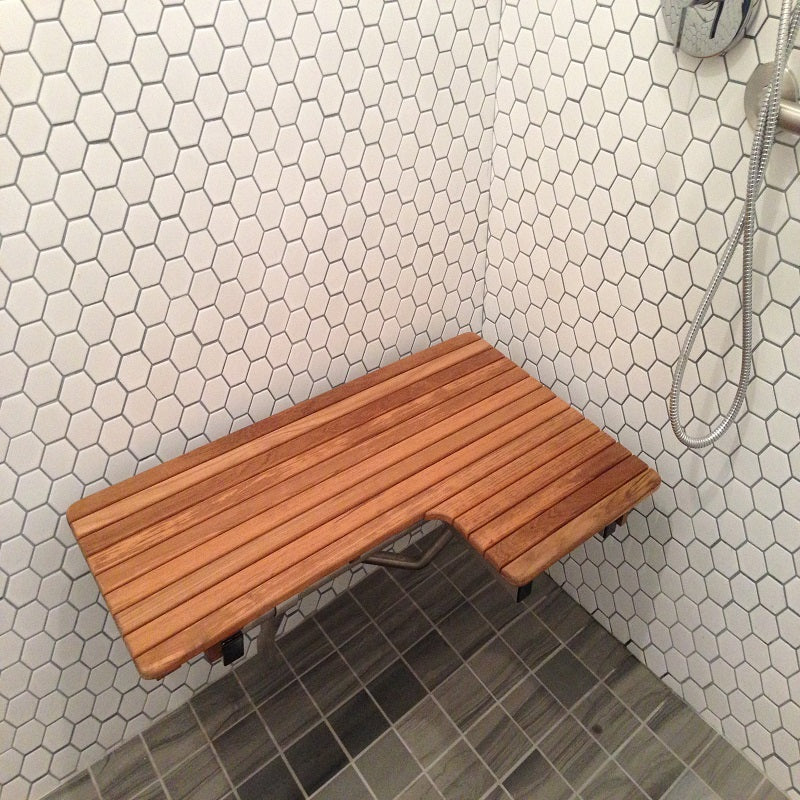 Upgrade your shower with this 30" Wide Teak ADA Left-Hand L-Shaped Shower Bench Seat for added accessibility and beauty. This bench is crafted using high quality FEQ heartwood teak and a sturdy frame of #304 stainless steel, all made in the USA. The natural slip resistant feature of teak provides both safety and elegance, reducing the risk of falls for you and your loved ones. With rounded battens and corners, this bench offers a comfortable seating area. It can be mounted at a height between 17" and 19" and meets or exceeds ADA guidelines for transfer benches.